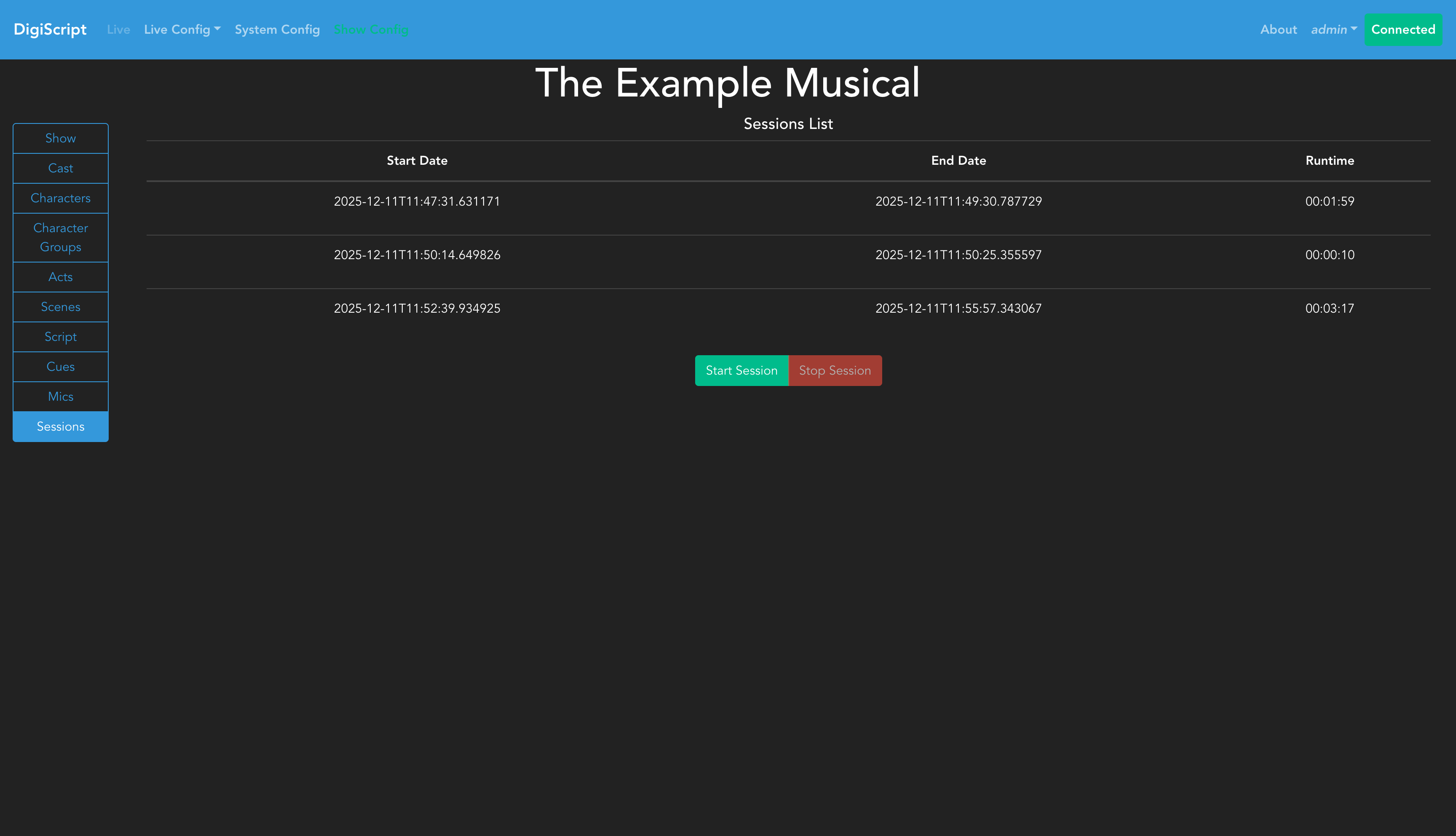 Click the Start Session button to begin a new live session. This will automatically navigate you, and all other connected clients, to the live show page.