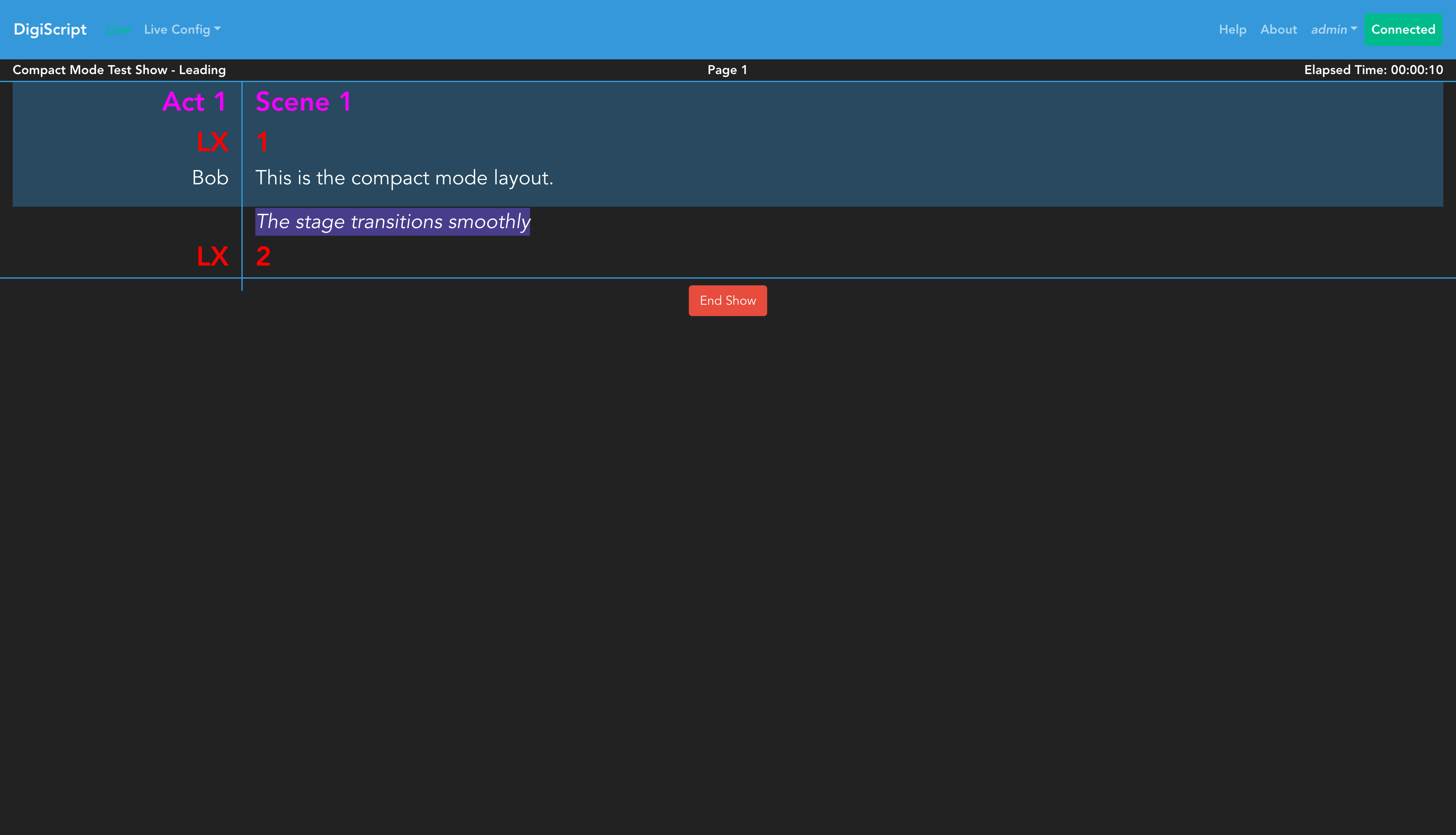 In COMPACT mode, the script displays in a single-column layout where: