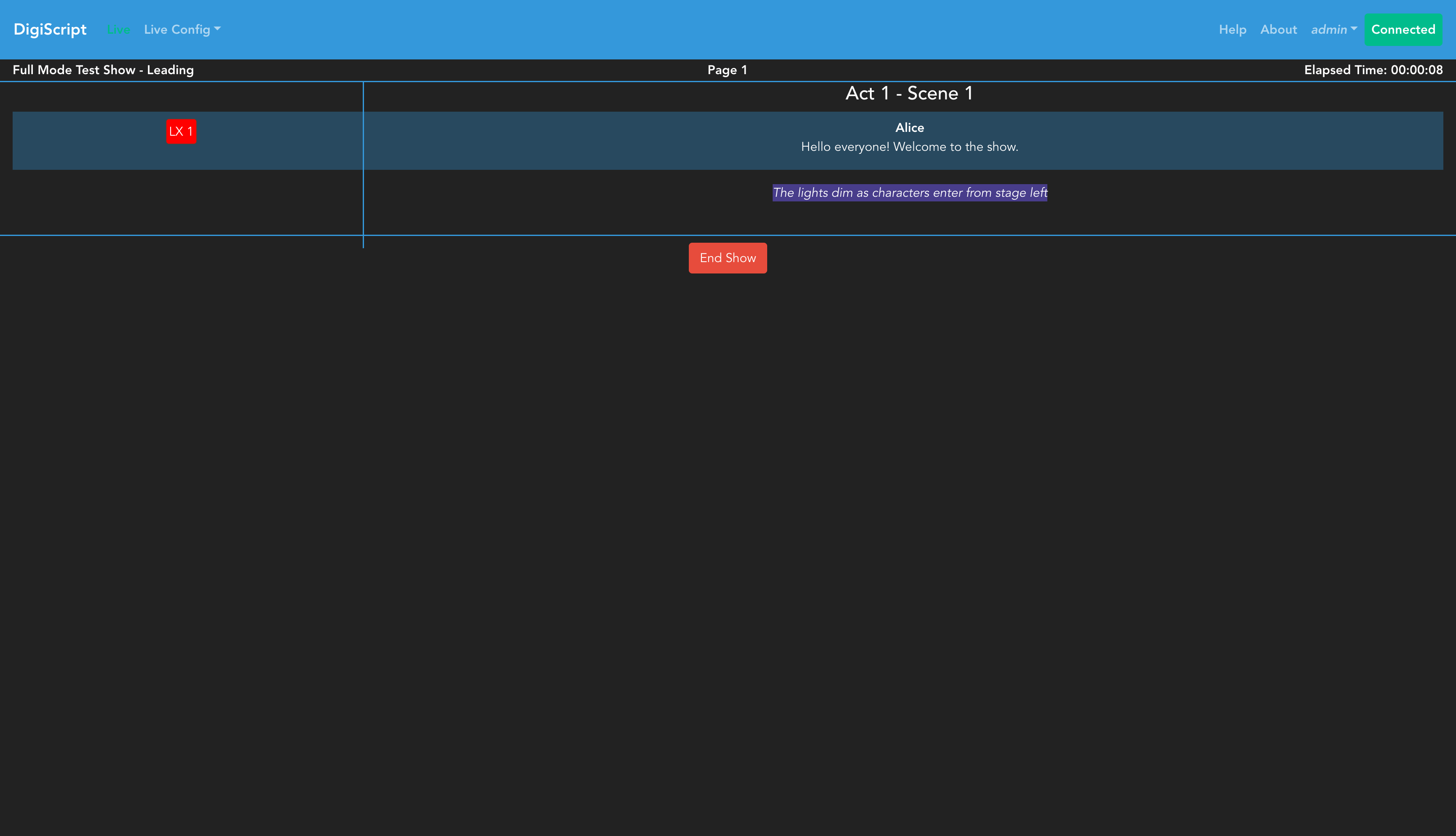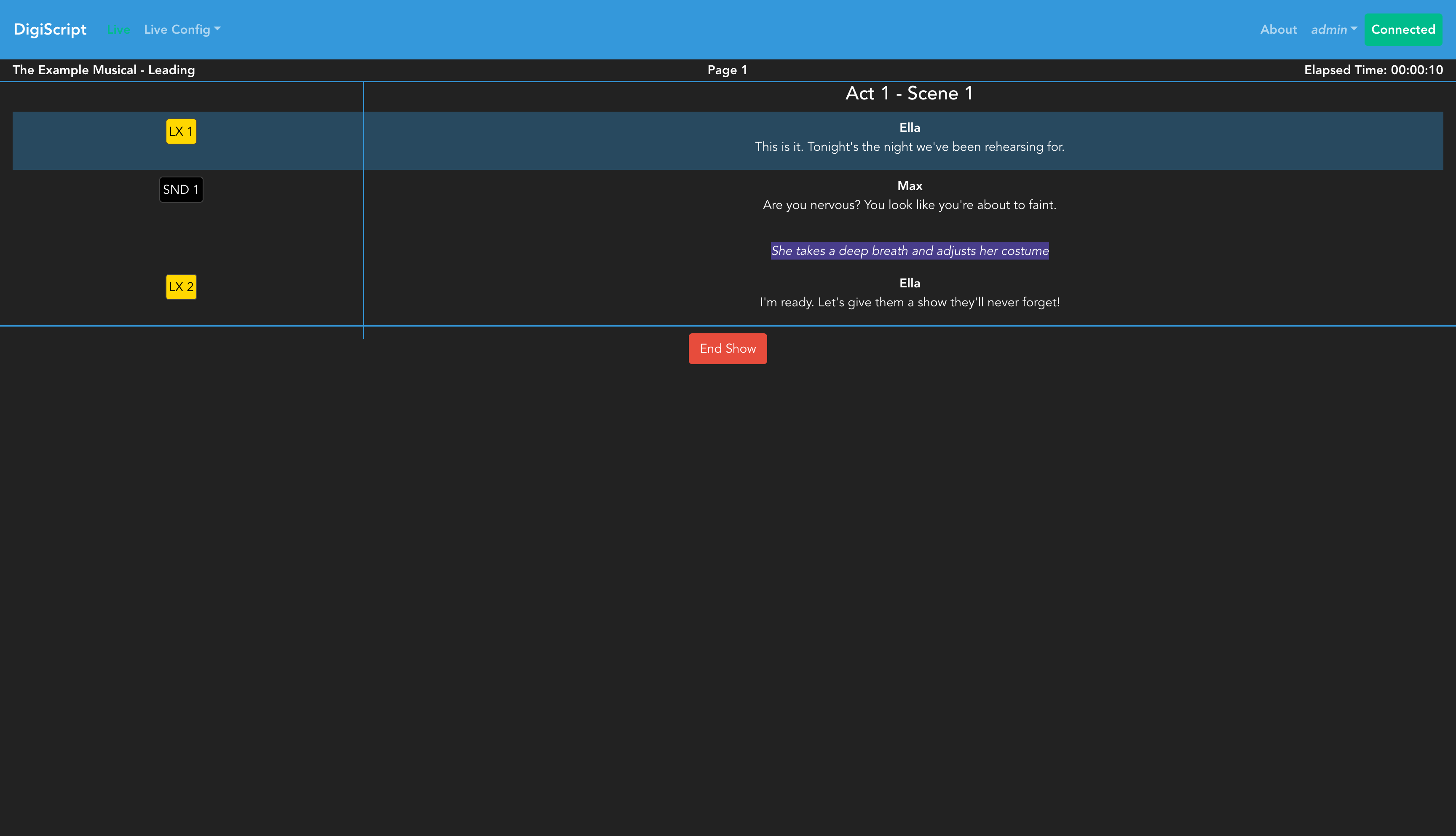 The live show page displays your script with cues, along with session information. The interface shows: