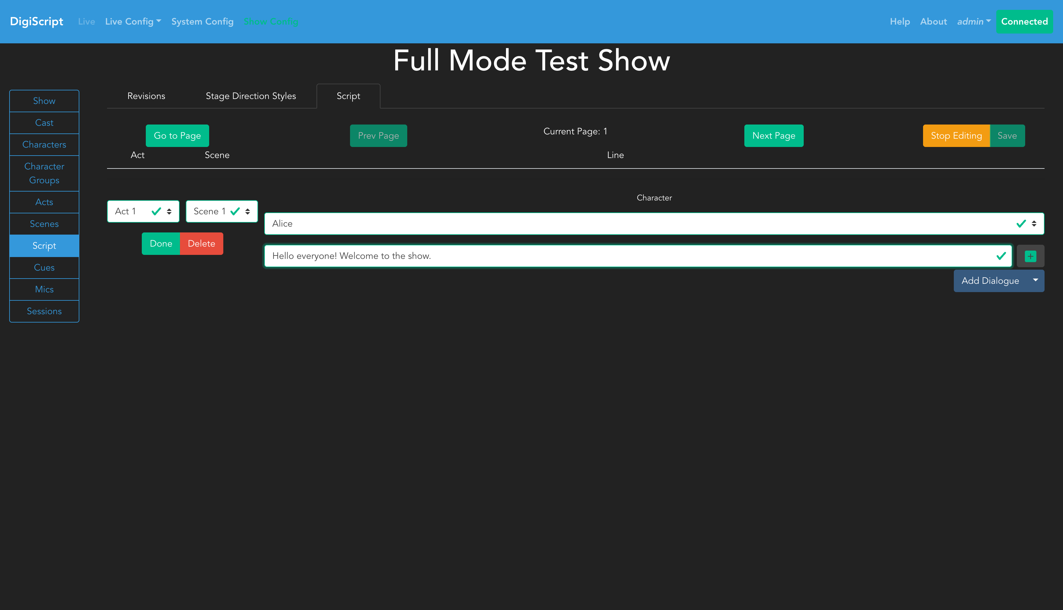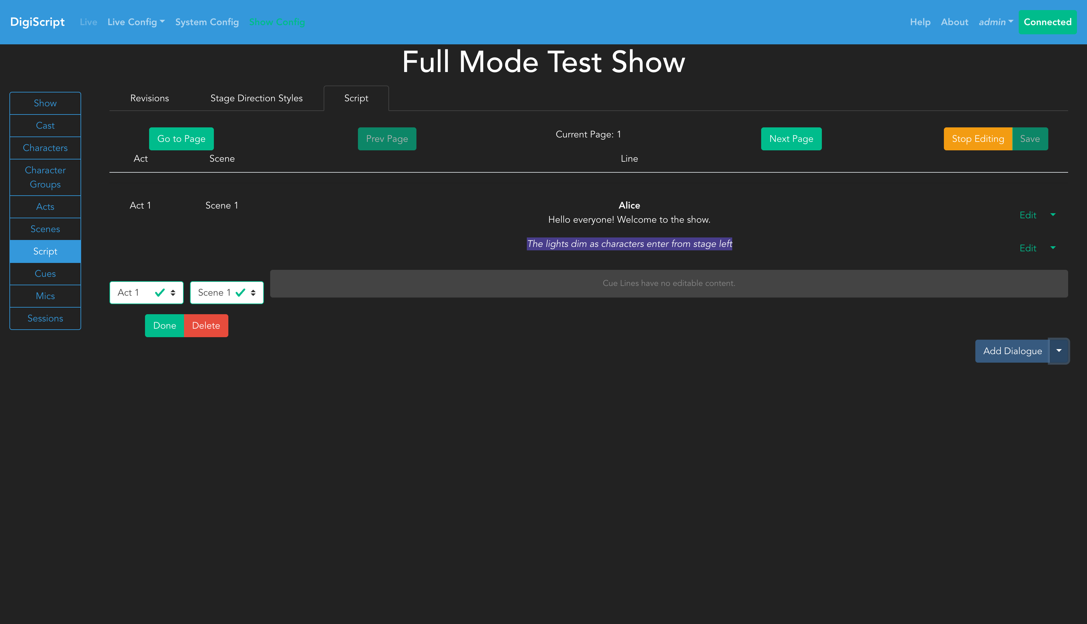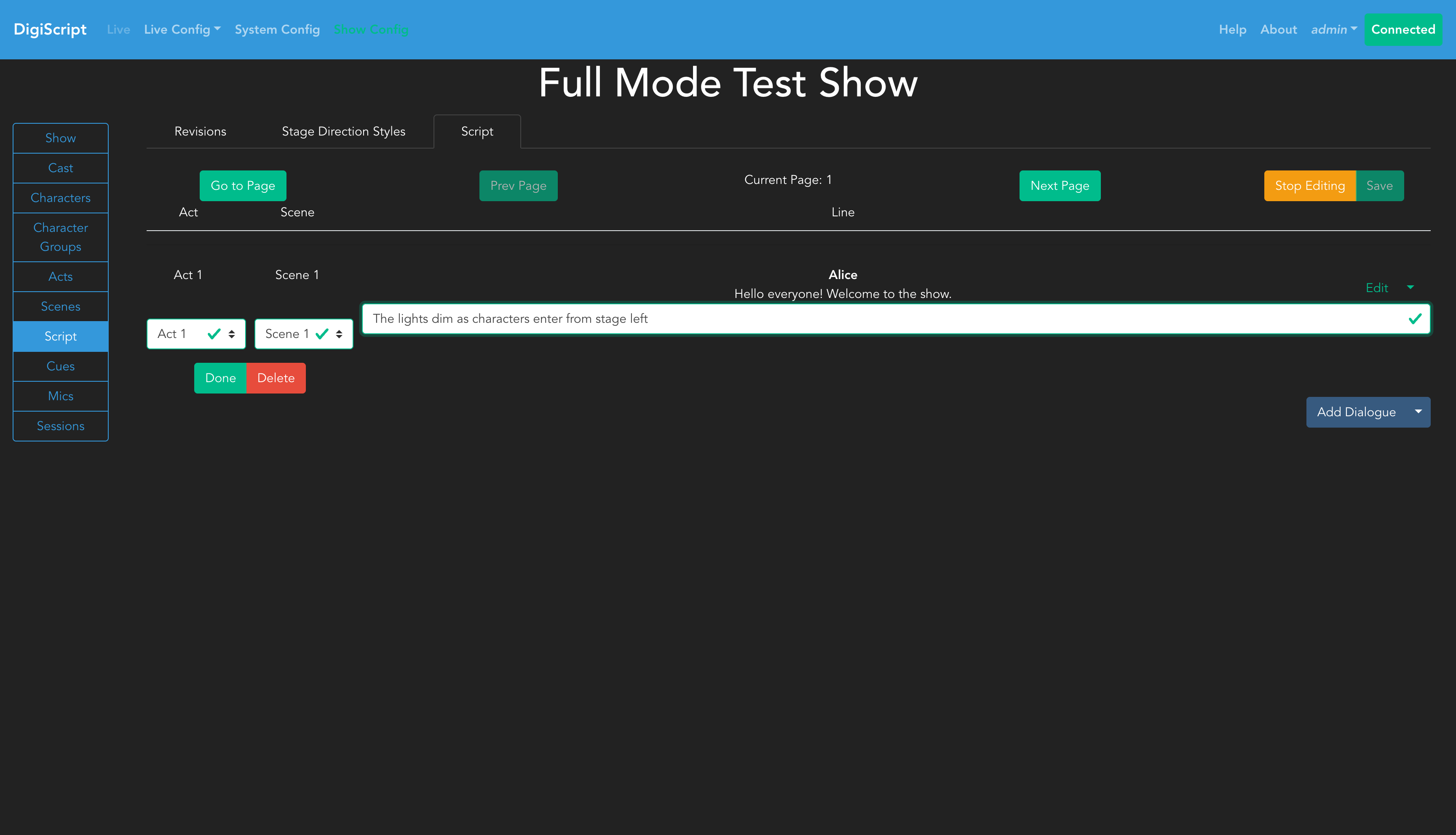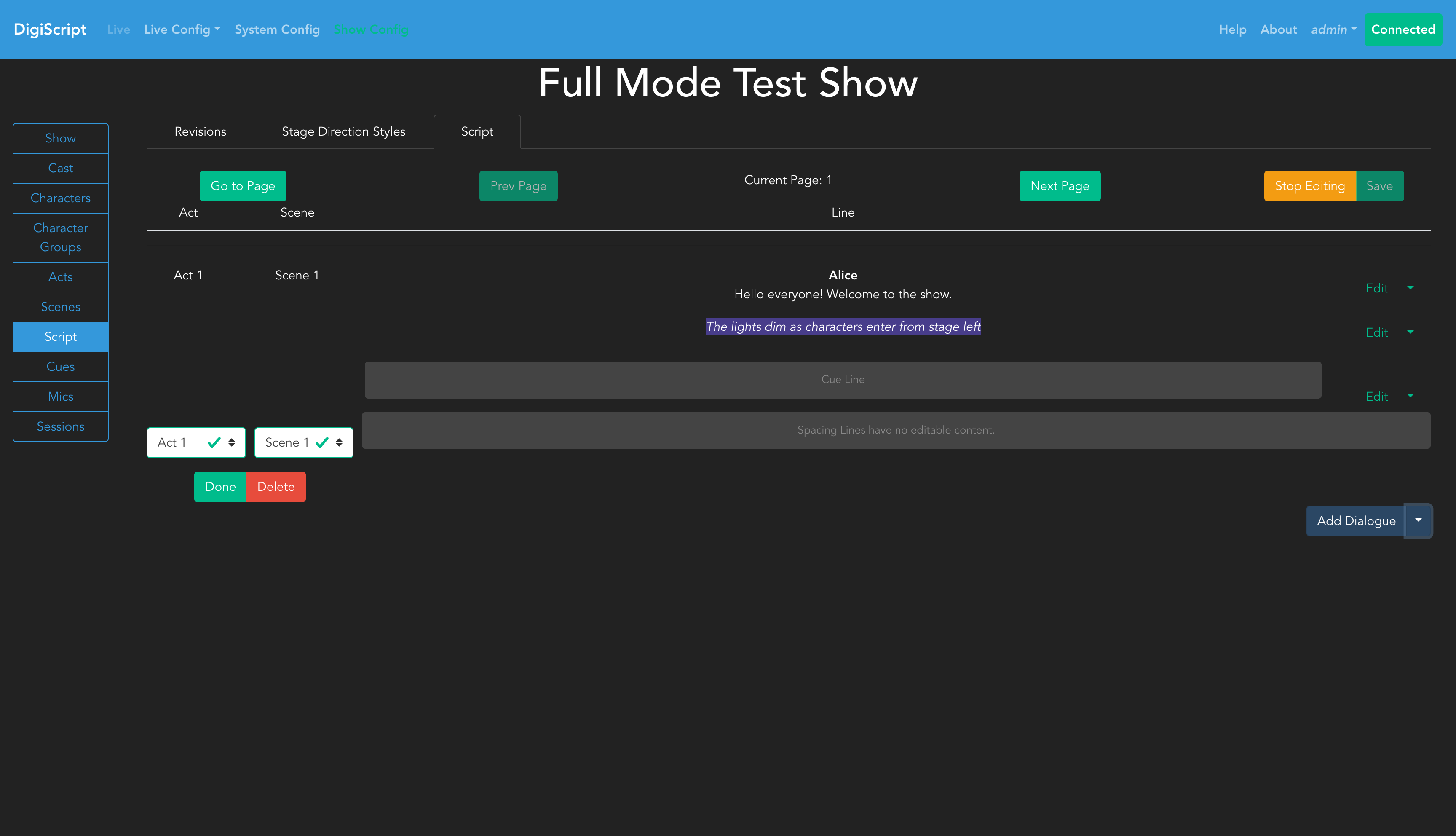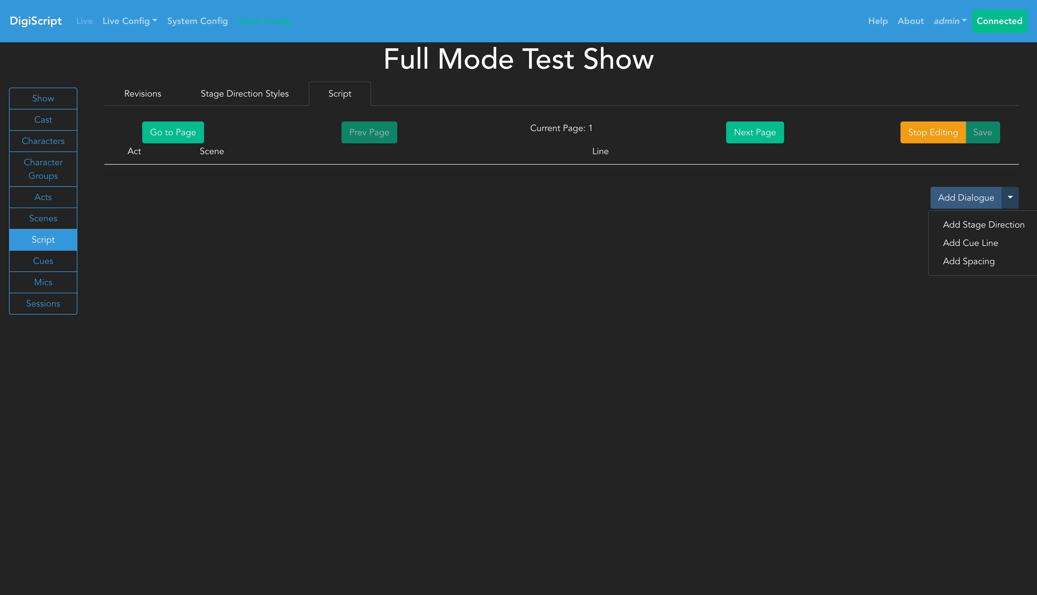 Once you have edit access, you’ll see options to Save the script, along with a dropdown button for Add Dialogue that provides access to all line types.