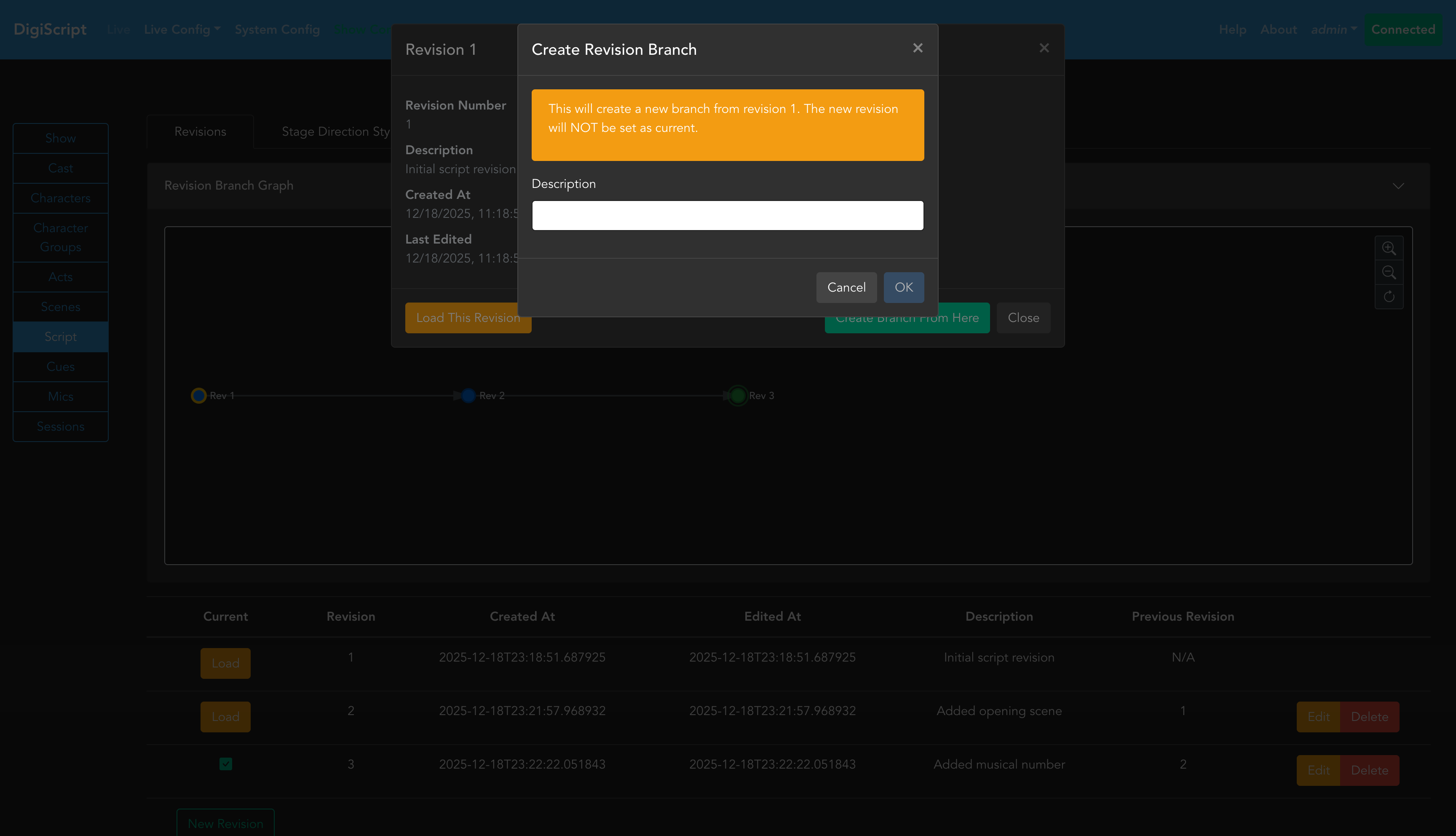 The Revision Branch Graph provides a visual representation of your script’s revision history, showing how revisions branch and evolve over time.