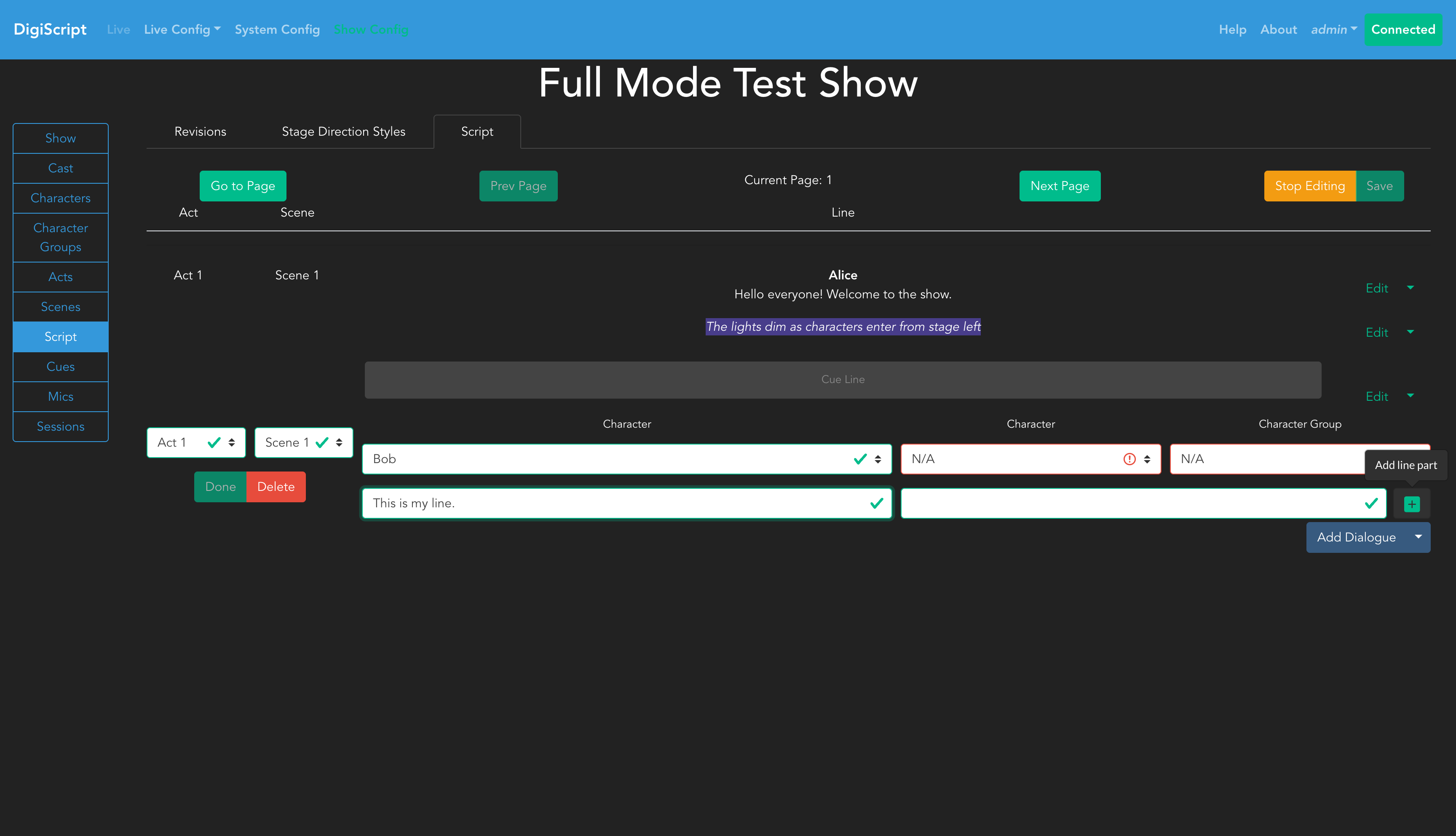 Important: After clicking Done, DigiScript automatically creates a new empty line. If you don’t need this line, click Delete before adding your next line. The script cannot be saved while lines are in edit mode.
