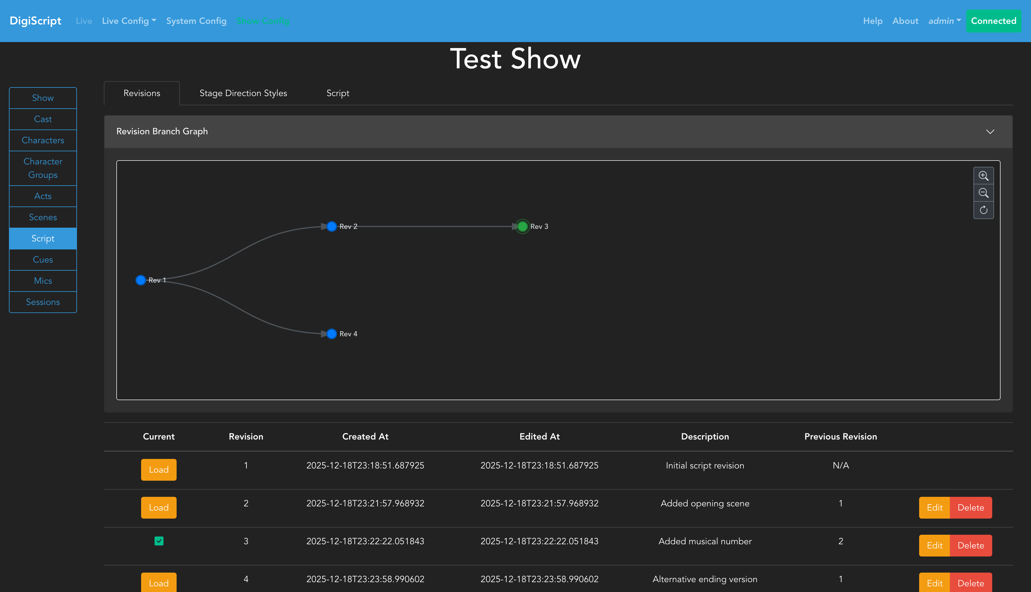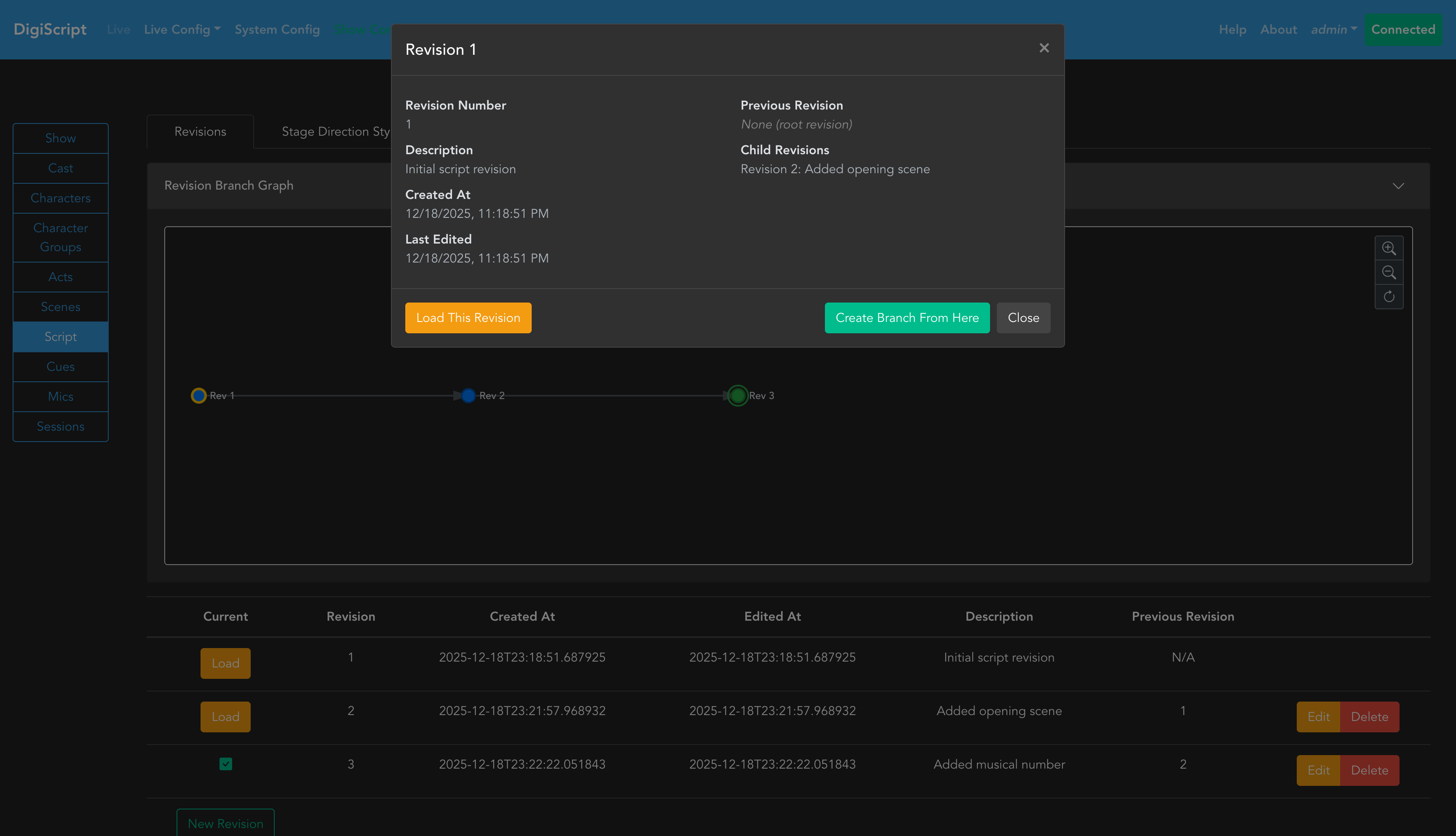 The Revisions tab is where you can manage script revisions. The table shows all revisions of the script and allows you to Add, Delete, Edit, or Load a revision.