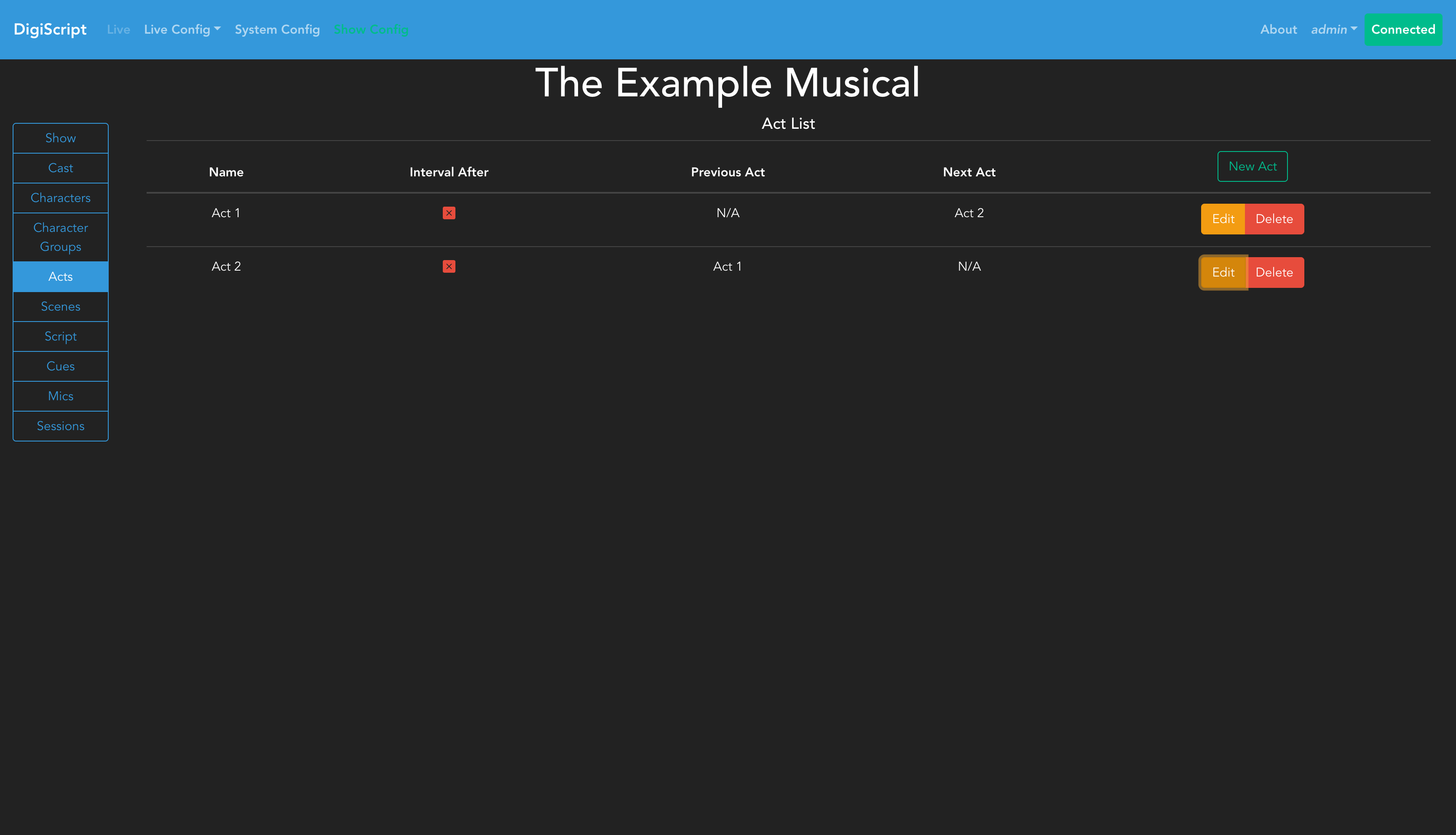 Click the Add button to create a new act. You’ll need to provide an act name and can optionally set the Previous Act field to establish the correct ordering of acts in the show. You can also configure whether there is an interval after this act.