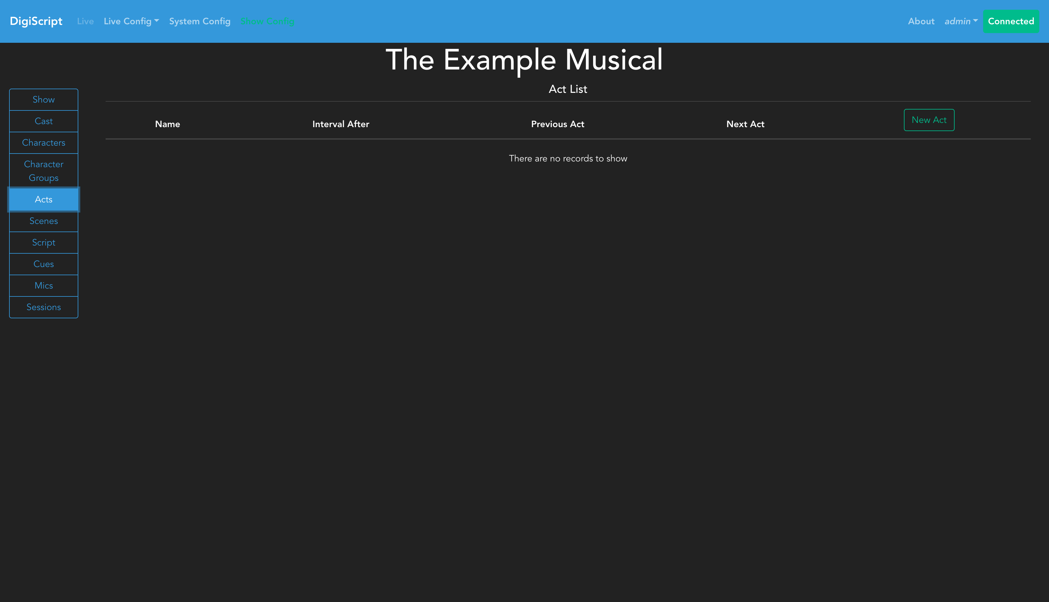 A show is made up of acts and scenes, so these are the next things to configure. Going to the Configure Acts tab will allow you to start this process. When you first access this page, you’ll see an empty acts list: