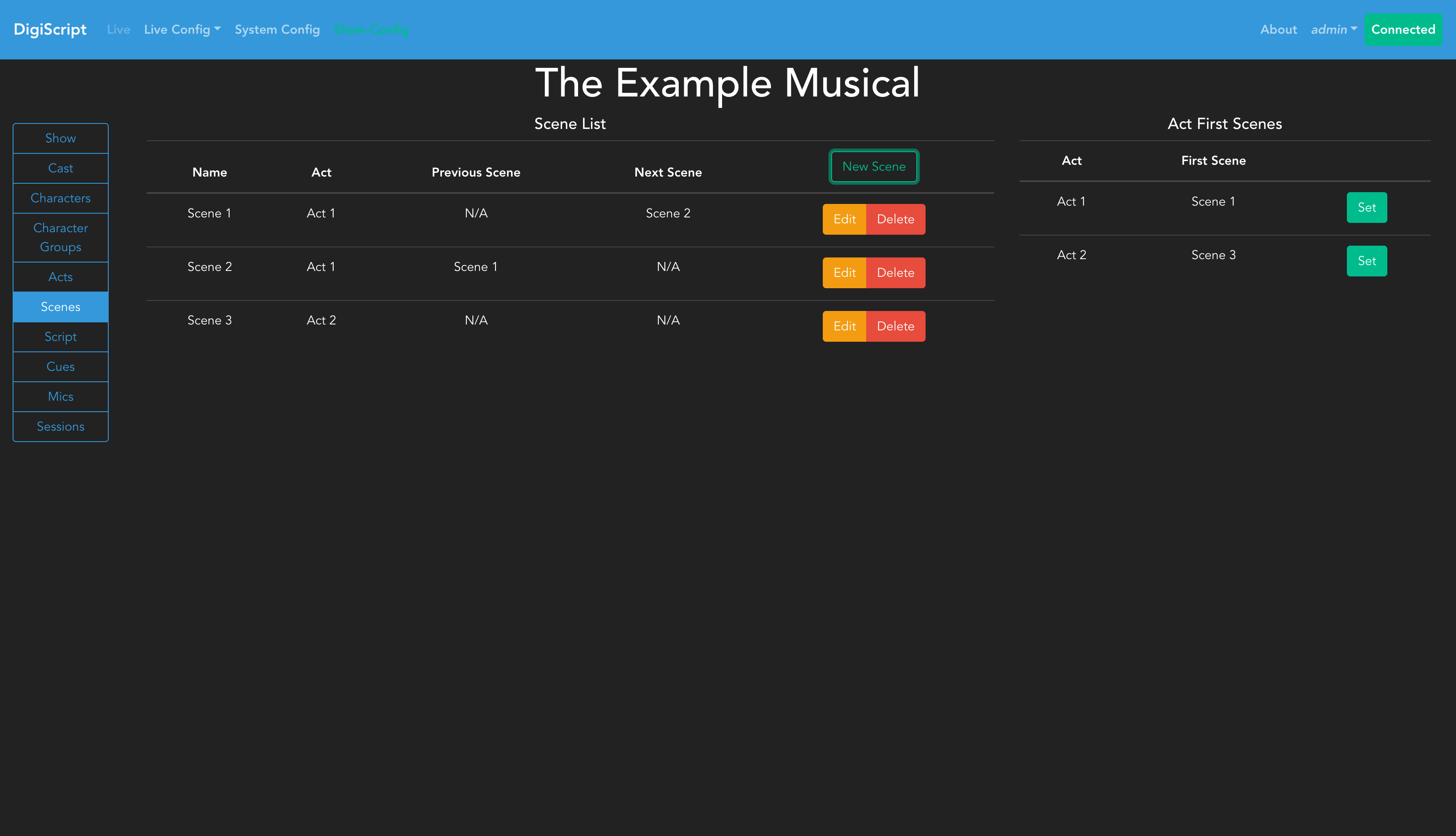 Scenes can be edited or deleted using the corresponding buttons. The scenes table displays which act each scene belongs to and their ordering within the show.