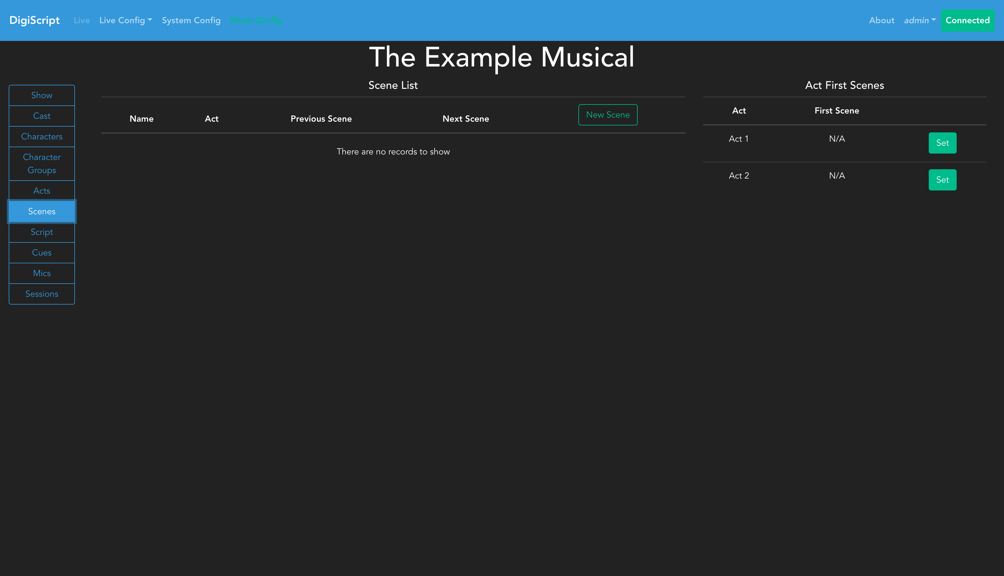 With the acts configured, the next step is to set up the scenes. Going to the Configure Scenes tab will bring up the overview page of all scenes in the show. Initially, the scene list will be empty: