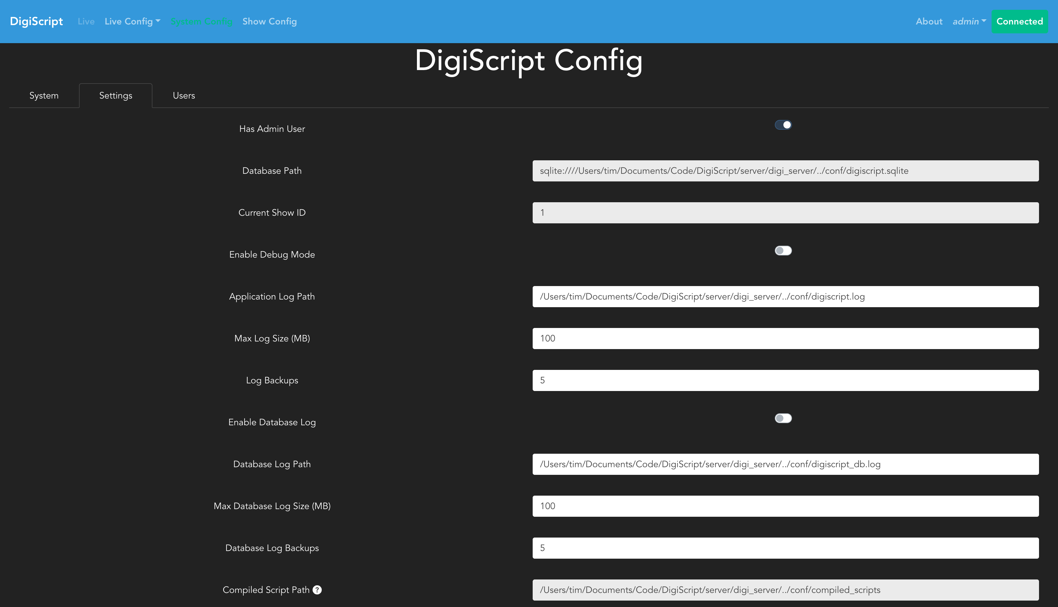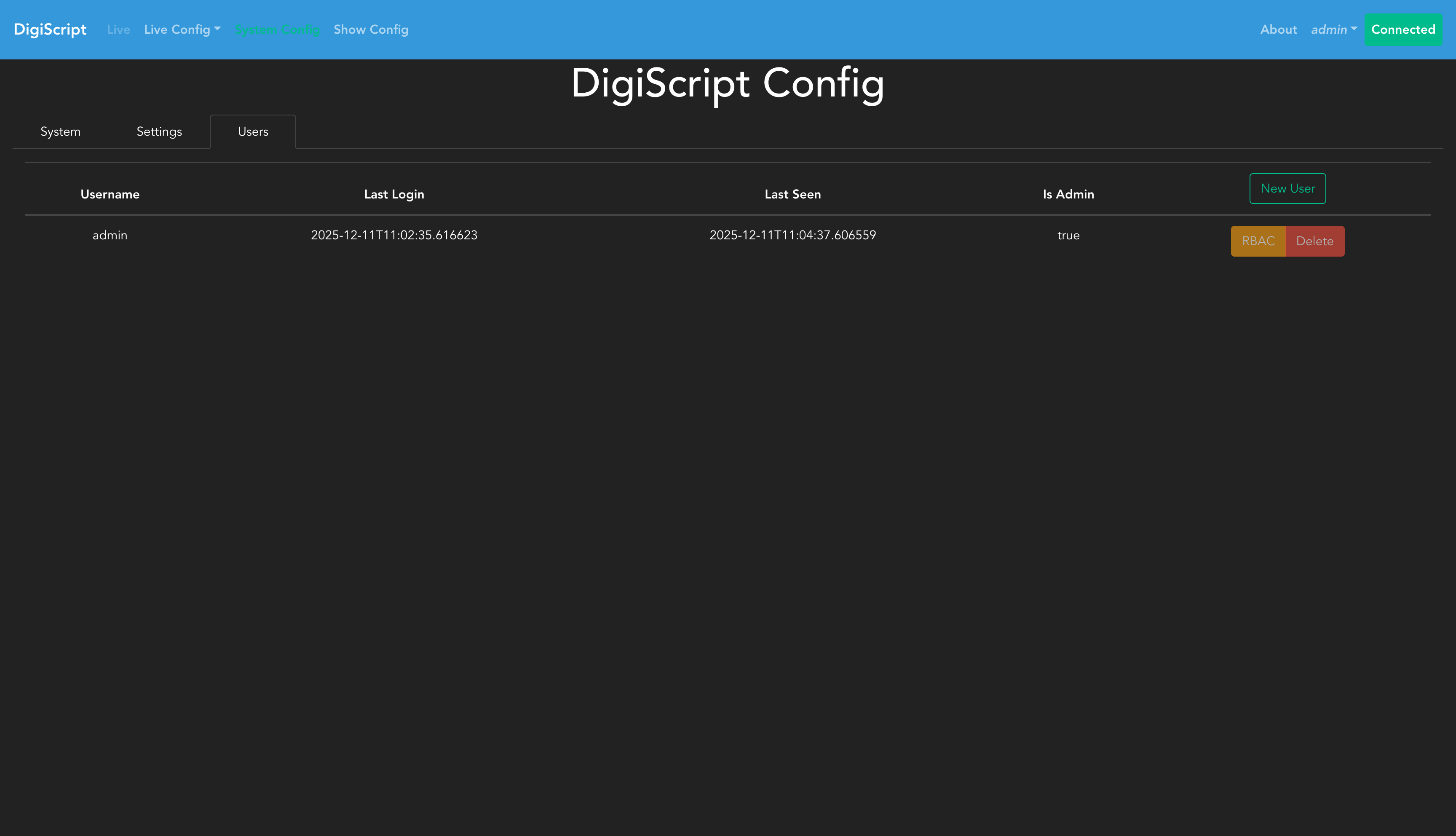 DigiScript allows you to create system-wide users and configure Role Based Authorization (RBAC) to control their access to shows and resources. This is an optional feature - the admin user created during application first launch has permissions to perform all actions and can be used as the sole administrator. However, adding users allows you to delegate specific permissions for tasks like configuring shows, editing scripts, or managing cues.